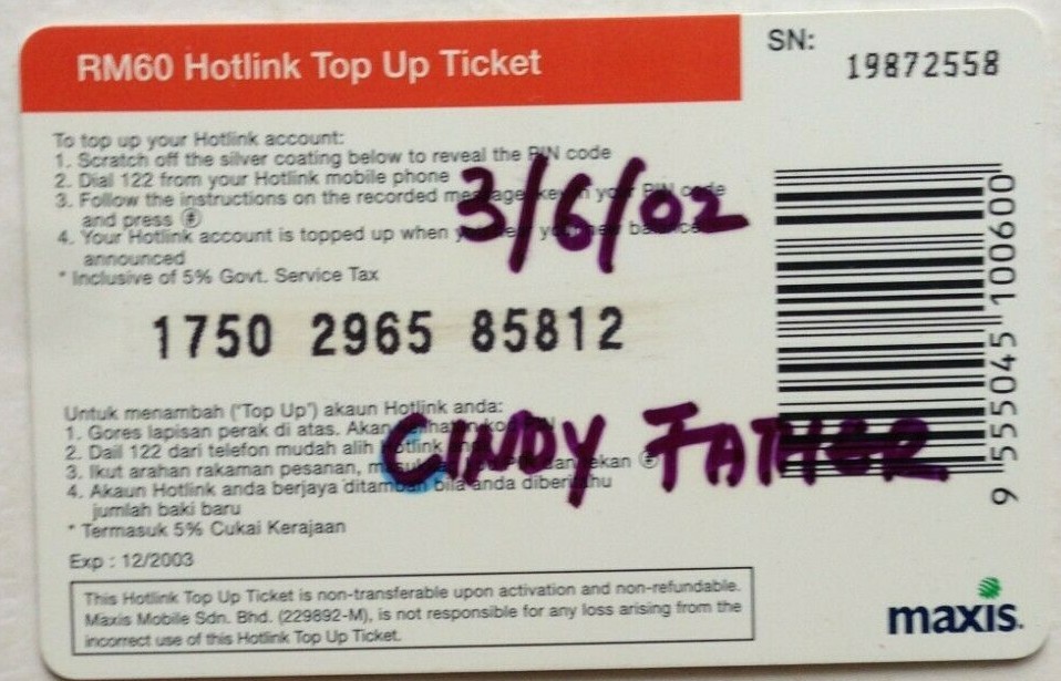 Malaysia Used Maxis Hotlink Top Up Ticket B Ebay